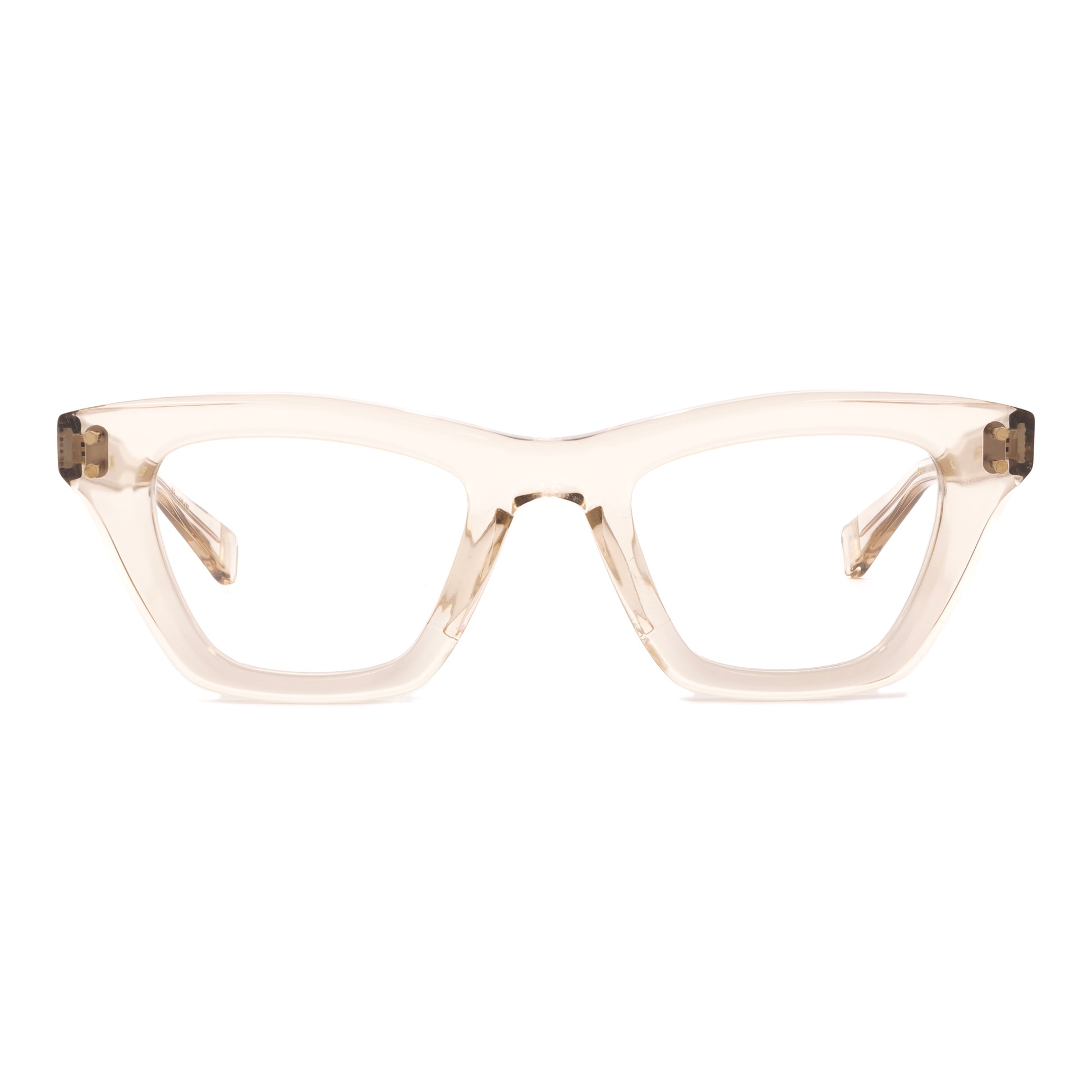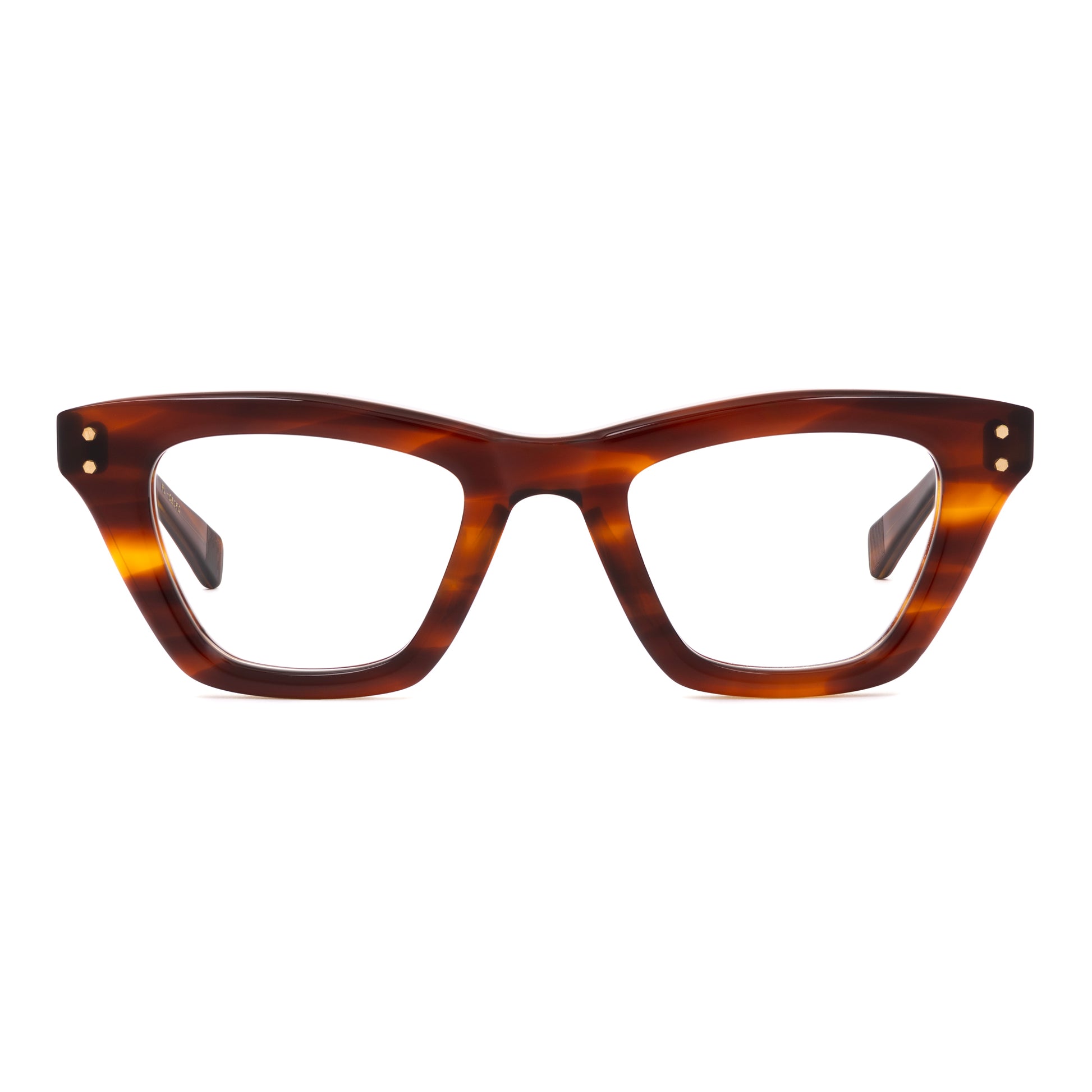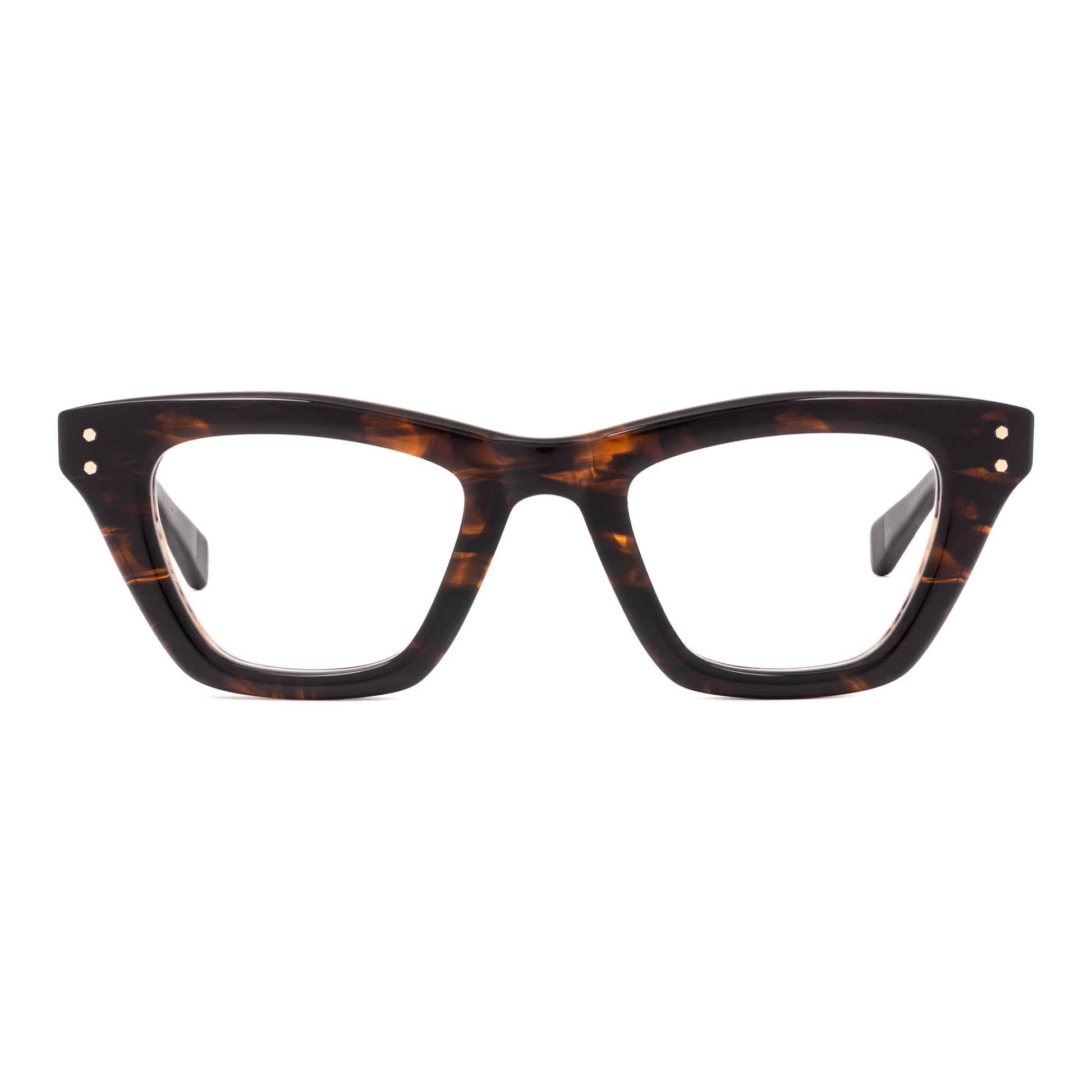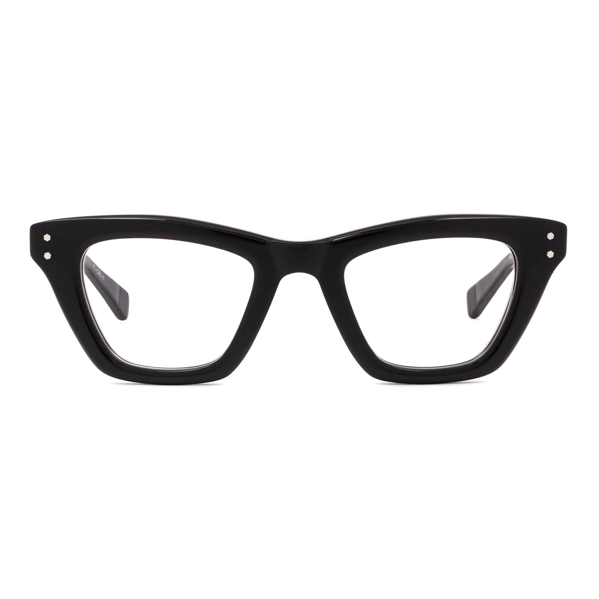 This frame has a slightly demon-like bend to it. Tapered top line dips in the middle, and the lenses are tweaked in and down. It has a sharp and squarish look to it, with the outside rim lines tapered in below the connections.