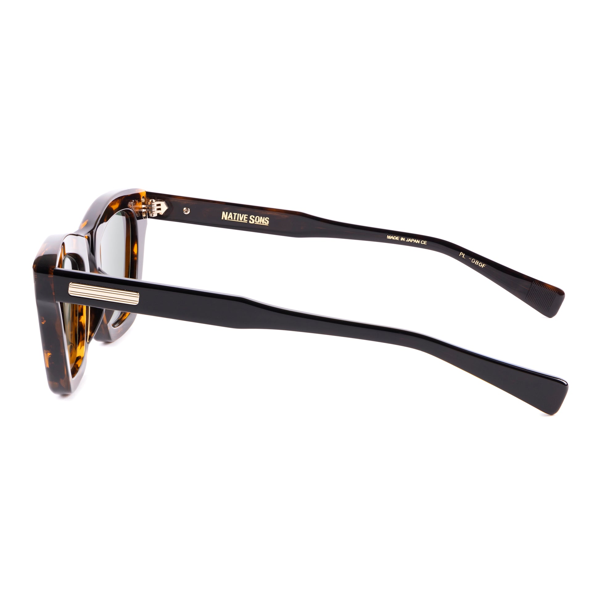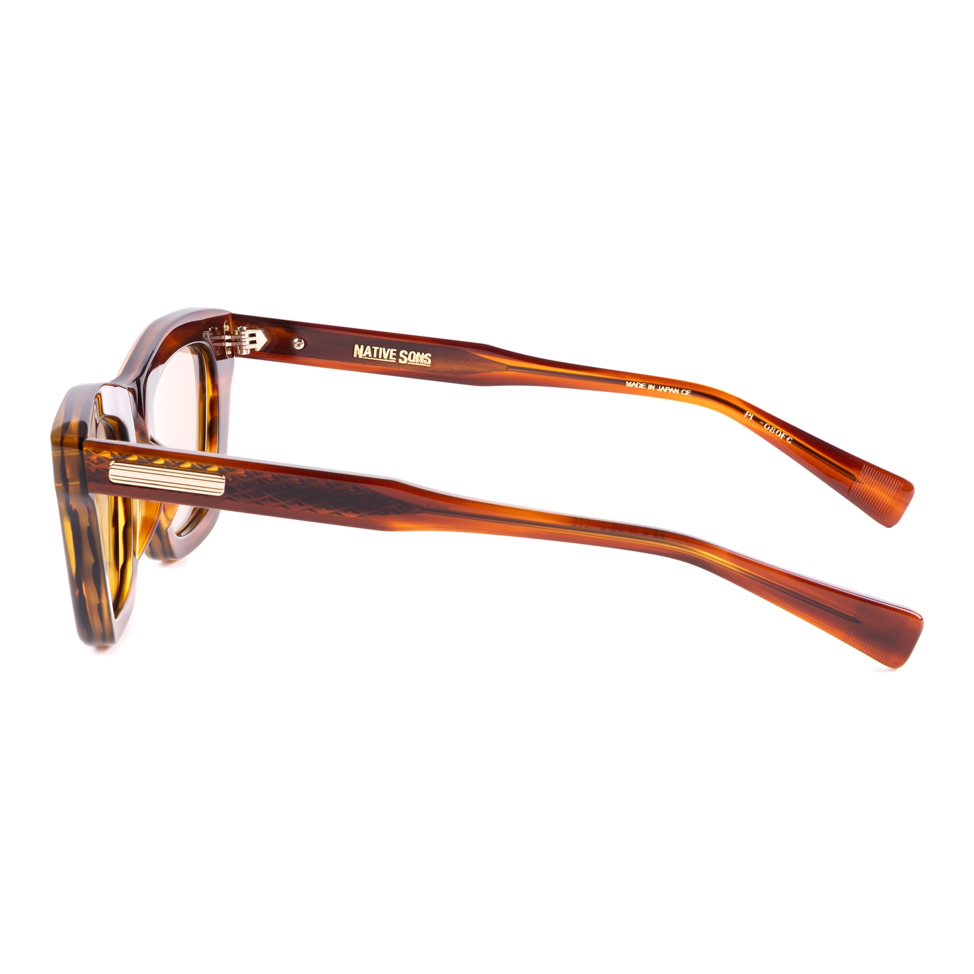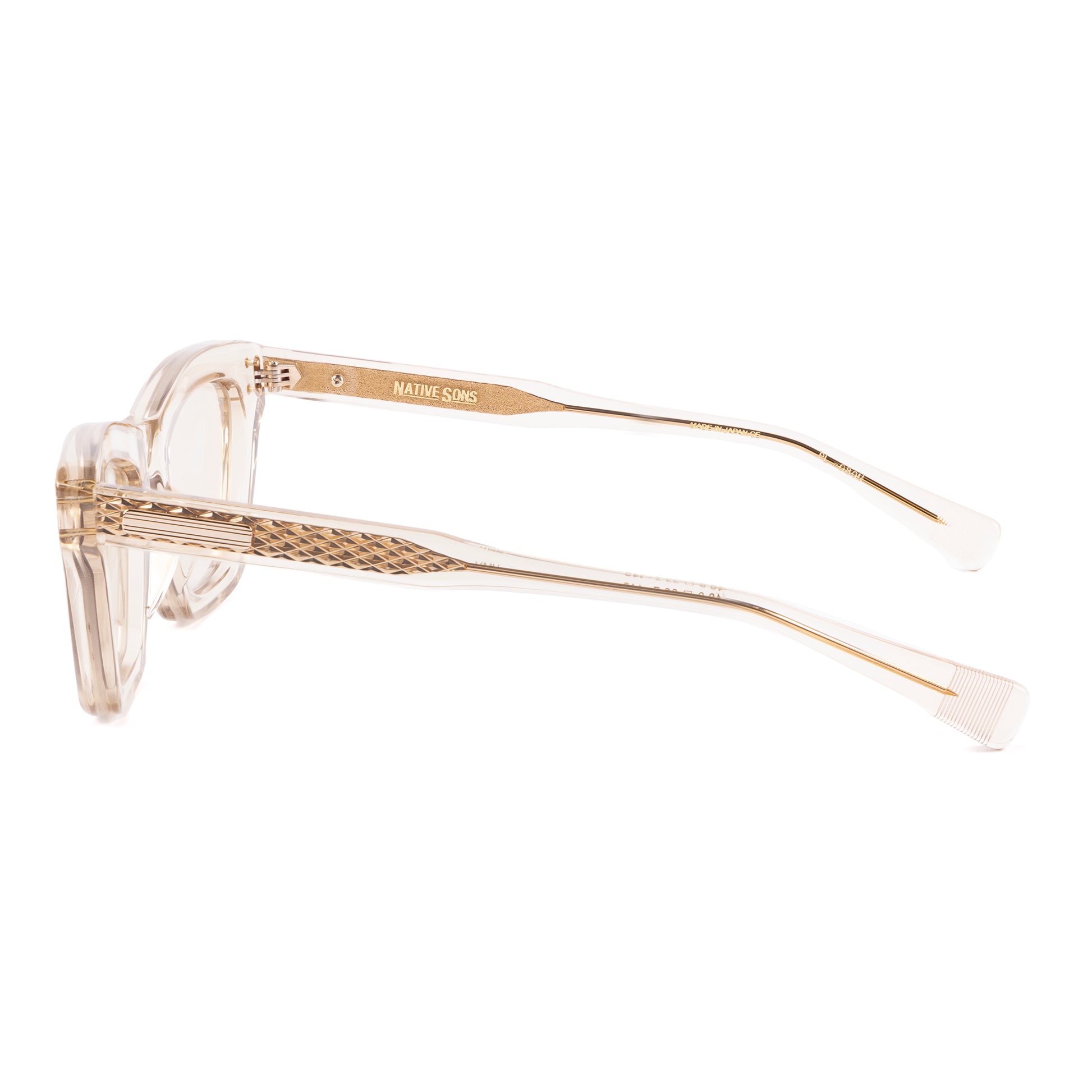 The temple is square heading back and tapers down to the shapeable bow. The point of taper differs top and bottom: finished at the end with squared-off temple tips.