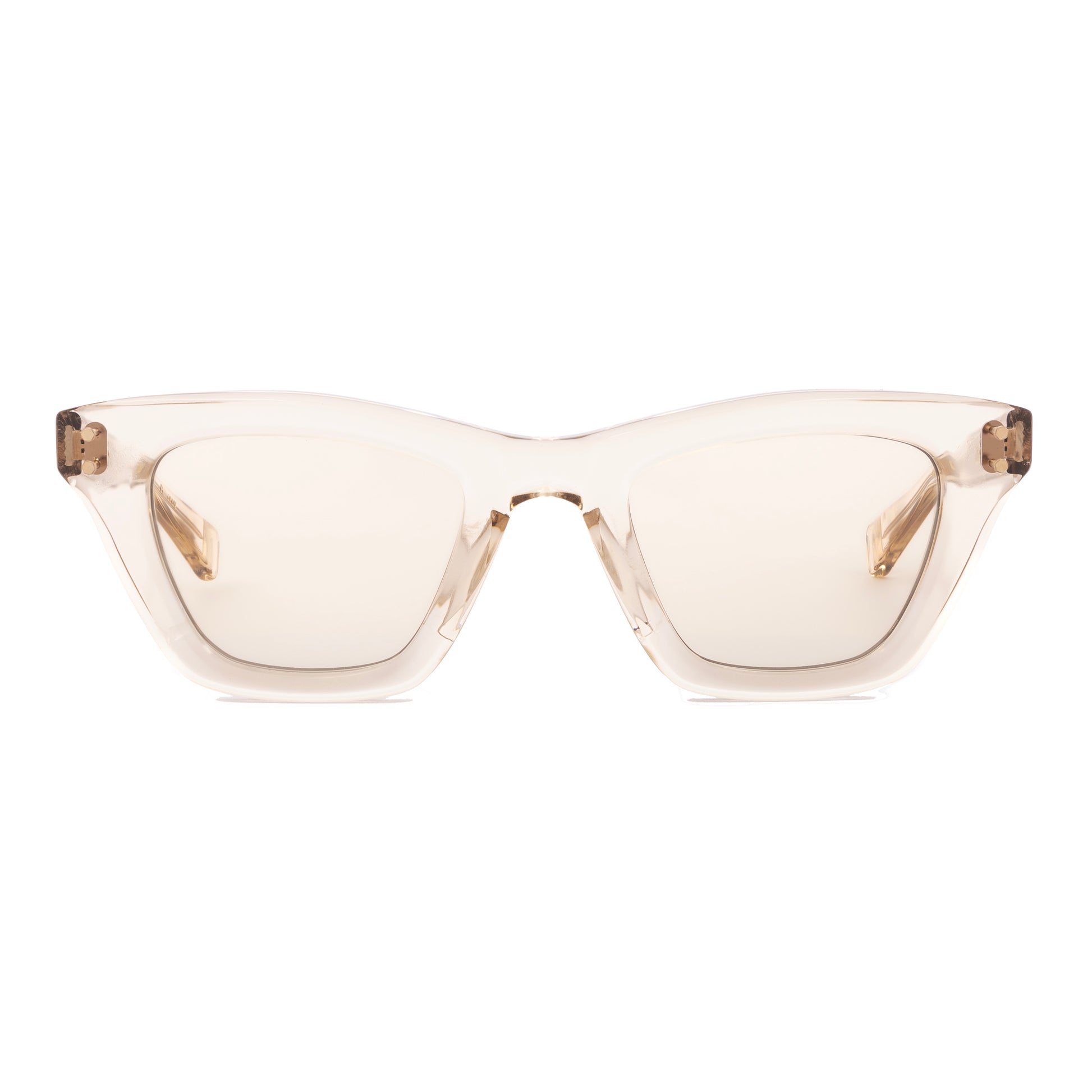 This frame has a slightly demon-like bend to it. Tapered top line dips in the middle, and the lenses are tweaked in and down. It has a sharp and squarish look to it, with the outside rim lines tapered in below the connections.
