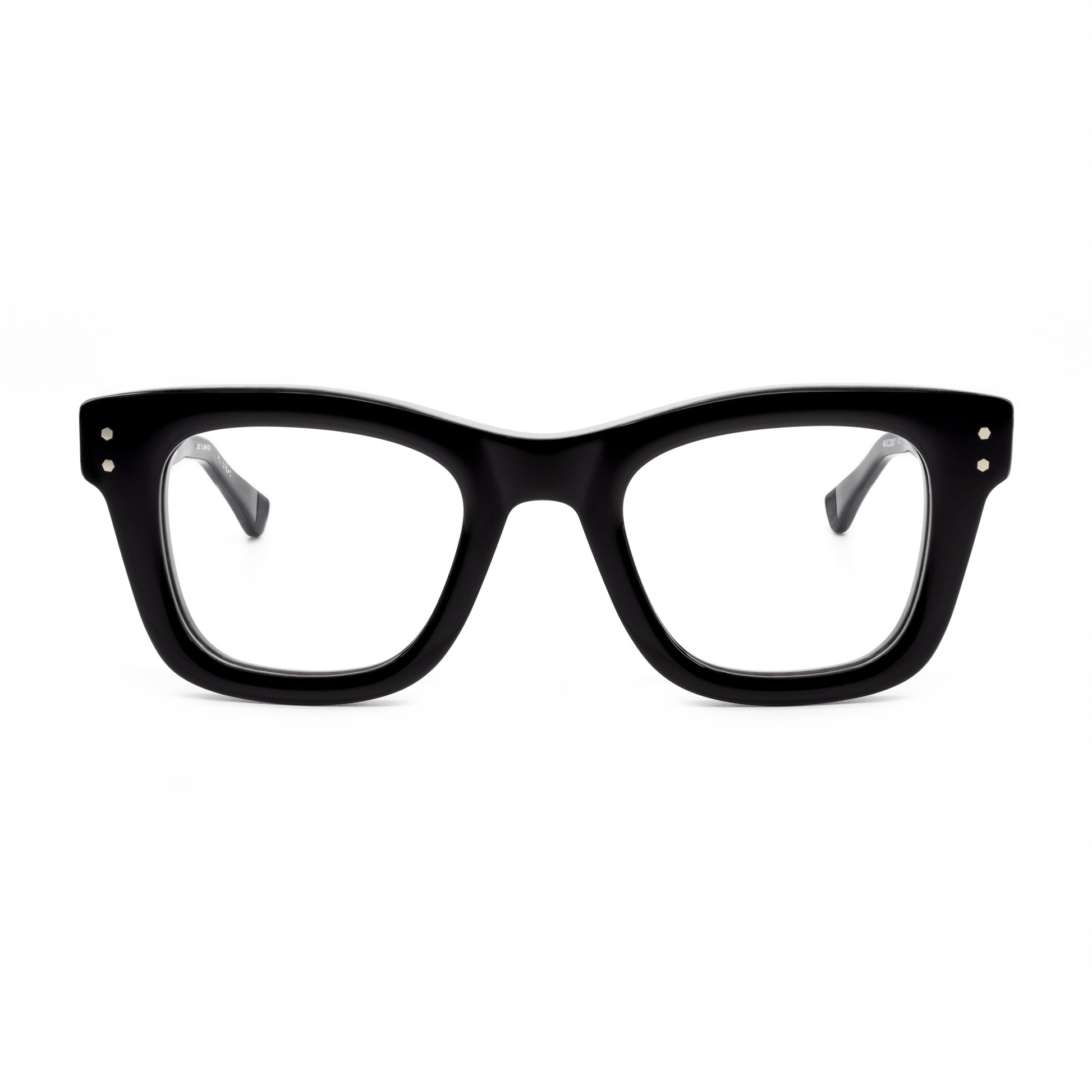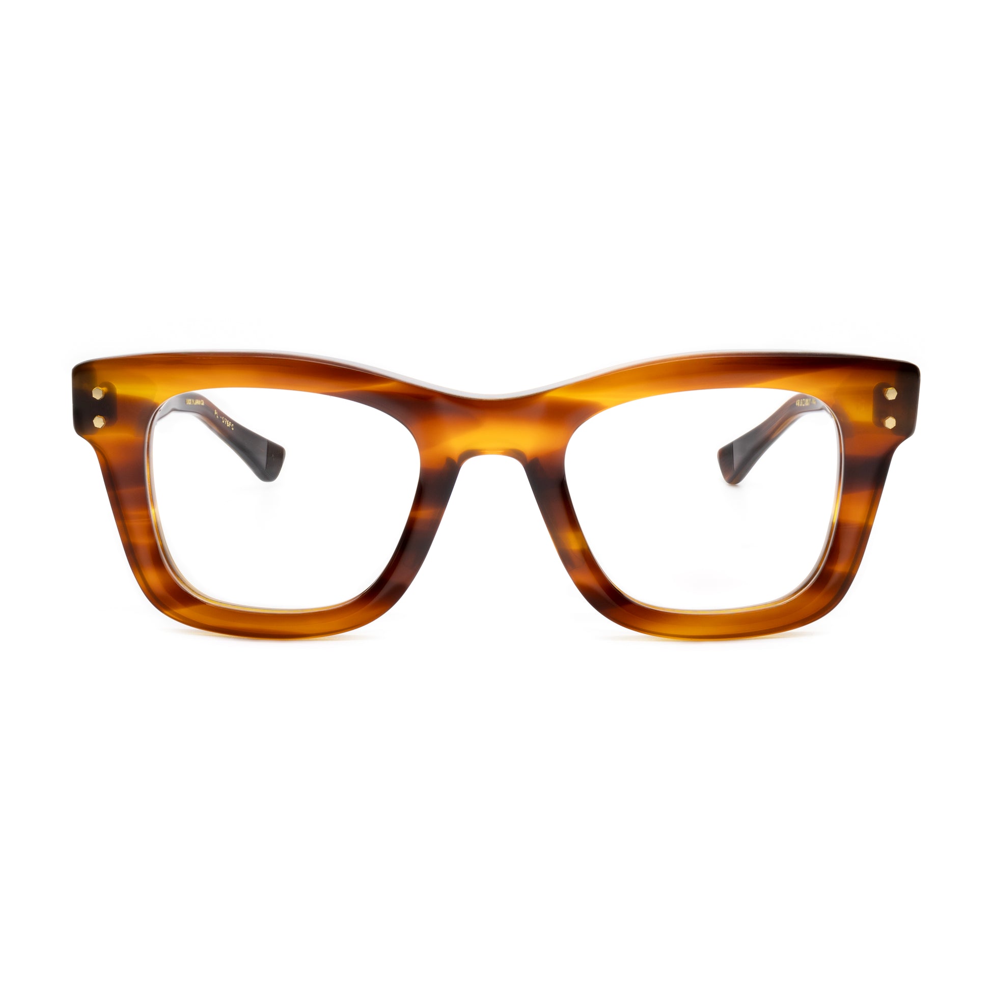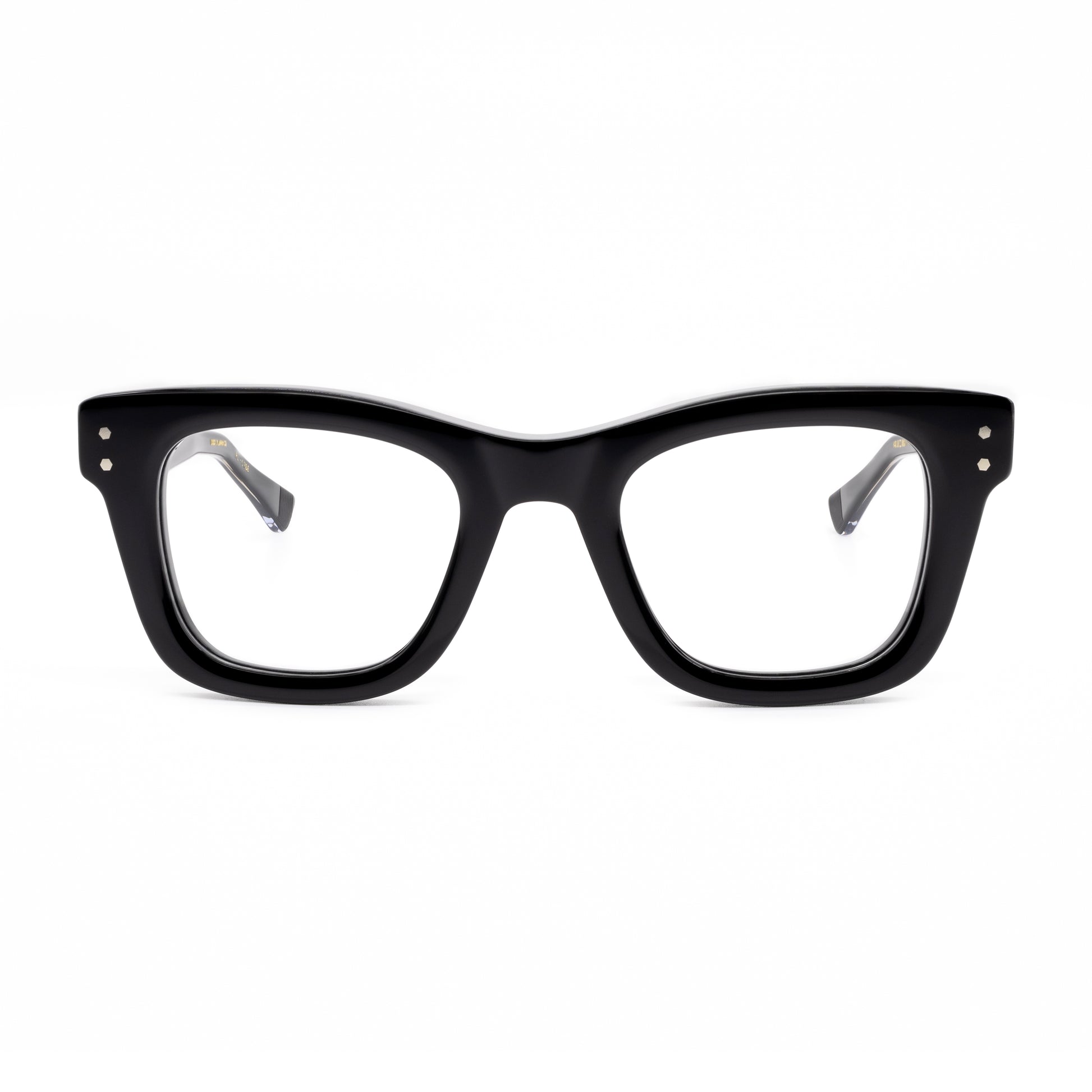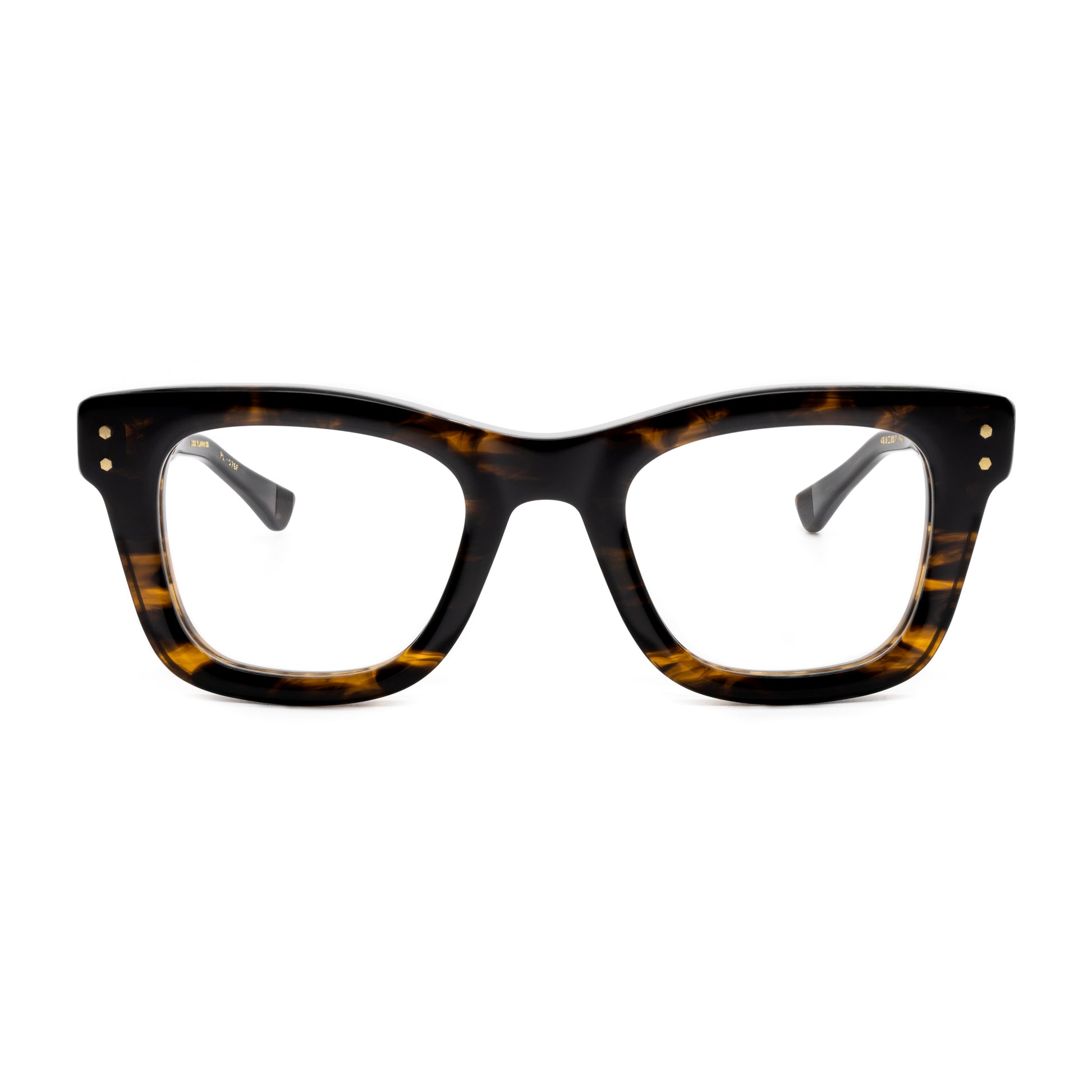 The top bridge is a subtle sweeping line skived beautifully down to the squared temple connections with vertical double hex rivets.