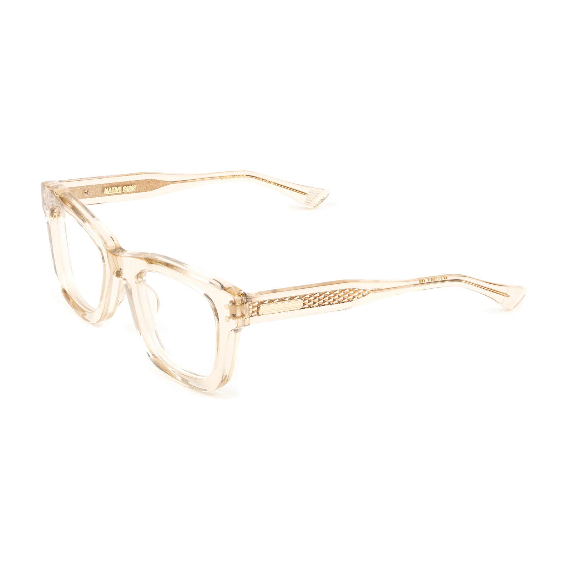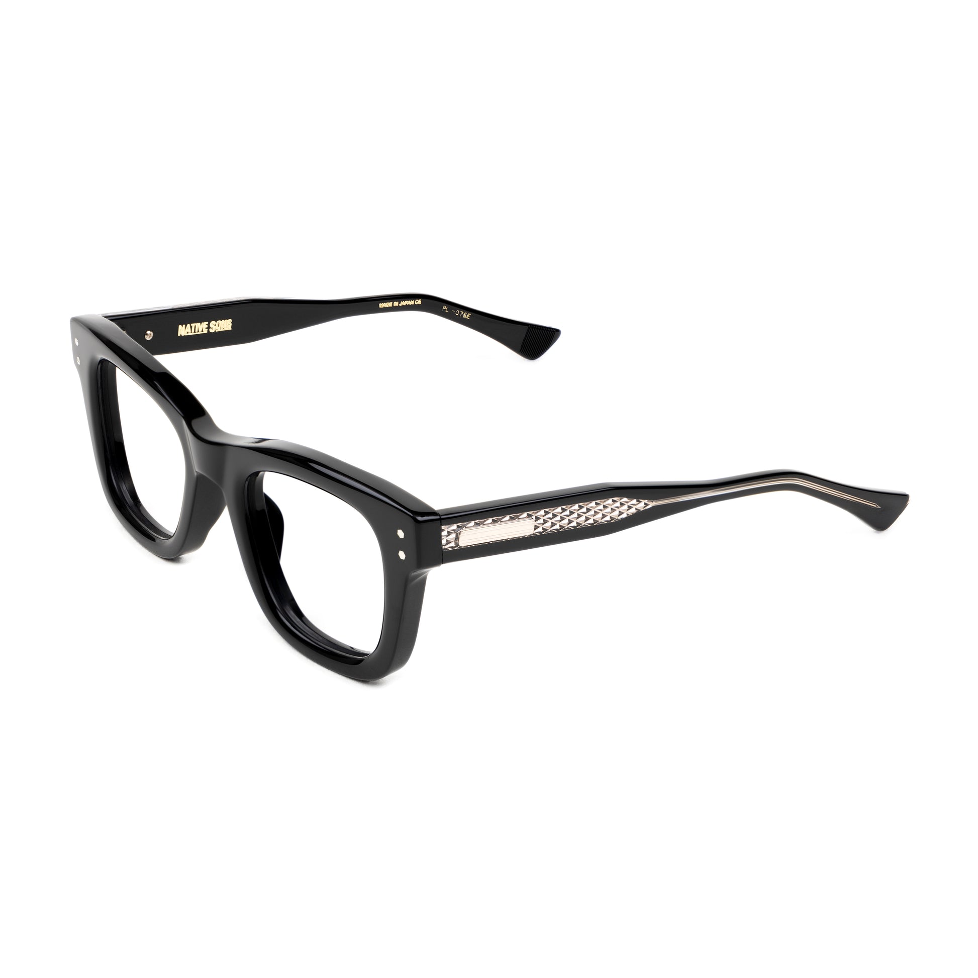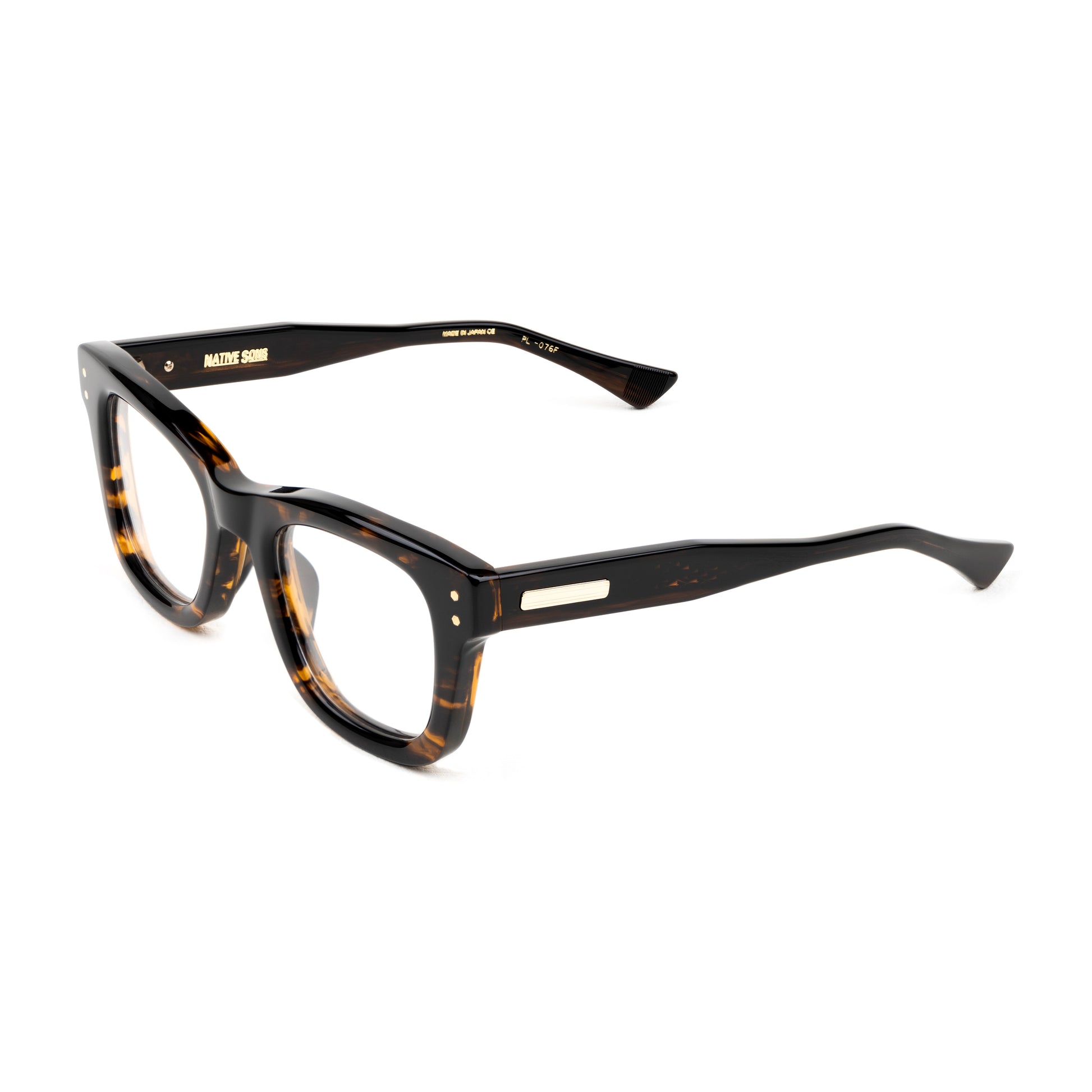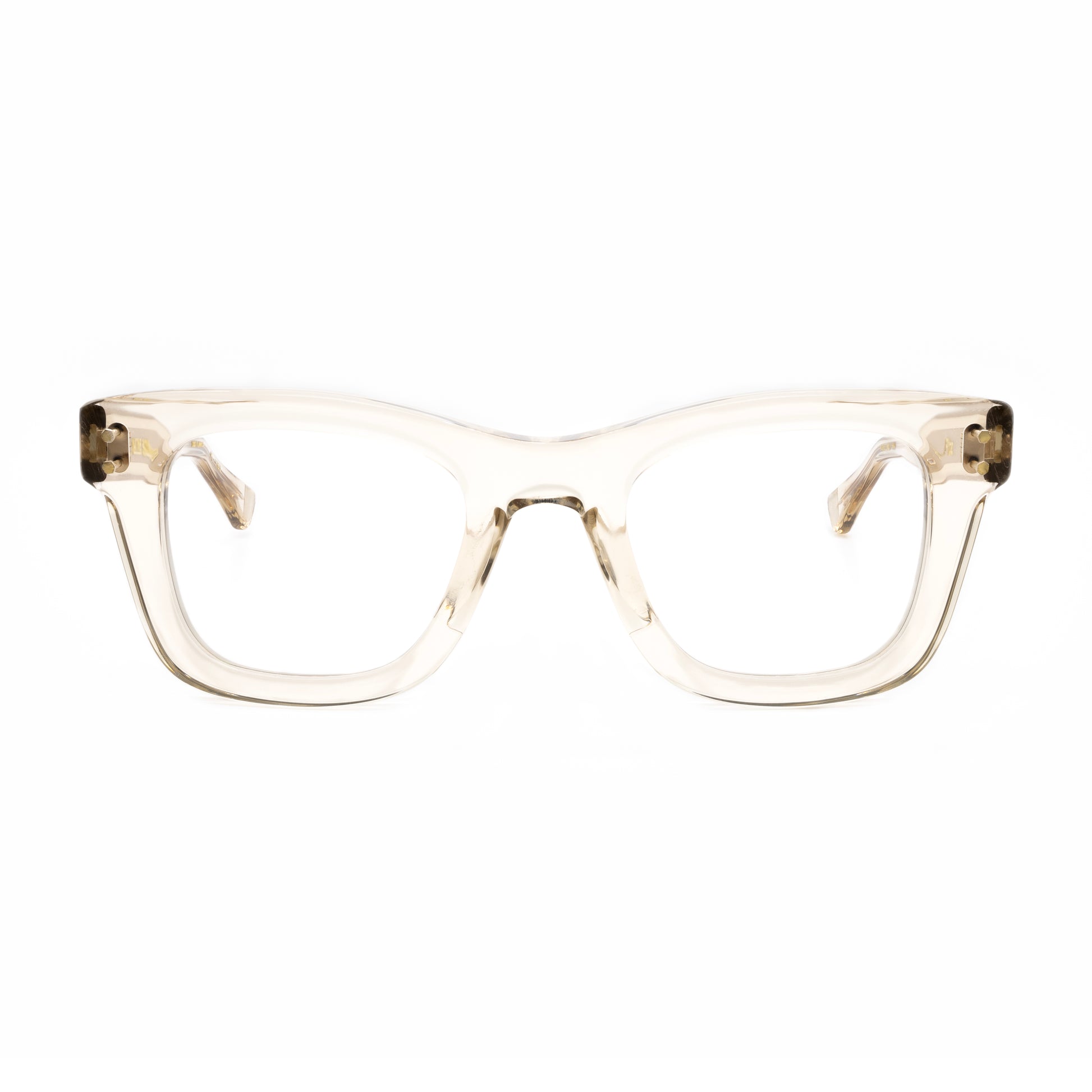 The top bridge is a subtle sweeping line skived beautifully down to the squared temple connections with vertical double hex rivets.